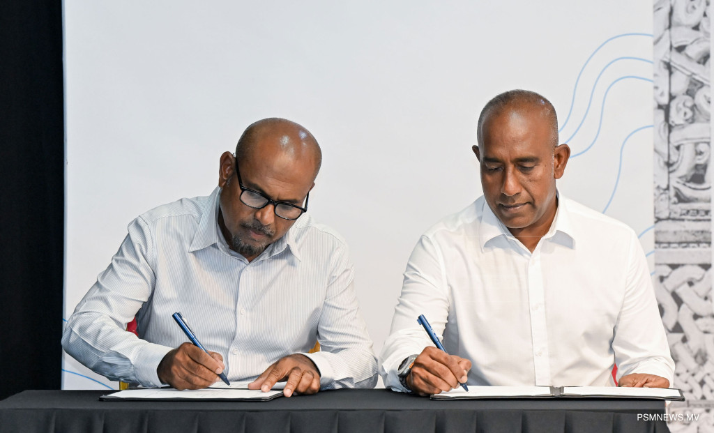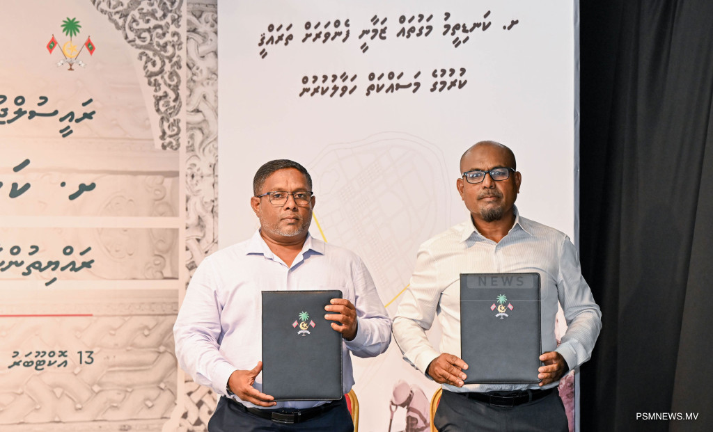 ށ. ކަނޑިތީމުގެ މަގުތައް ޒަމާނީފެންވަރަށް ތަރައްޤީކުރުމާއި ގުޅޭ އެއްބަސްވުމުގައި އިމާރާތްކުރުމާއި ގެދޮރުވެރިކަމާއި ބިނާރާބެހޭ ވުޒާރާގެ ސްޓޭޓް މިނިސްޓަރ ހަސަން ރަޝީދު އަދި އާރުޑީސީގެ މެނޭޖިން ޑިރެކްޓަރ އިބްރާޙިމް ނަޒީމް ސޮއިކުރެއްވުން / ފޮޓޯ - ރައީސް އޮފީސް