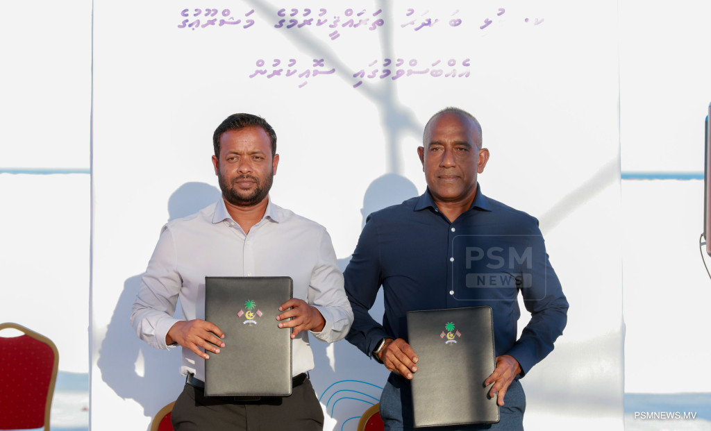 ކ. ގުޅީ ބަނދަރު ތަރައްޤީކުރުމުގެ މަޝްރޫޢުގެ މަސައްކަތް ހަވާލުކުރުމުގެ އިމާރަތްކުރުމާއި ގެދޮރުވެރިކަމާއި ބިނާރާބެހޭ ވަޒީރު ޑރ. ޢަބްދުﷲ މުއްޠަލިބު އަދި އެމްޓީސީސީގެ މެނޭޖިން ޑިރެކްޓަރ އަޙުމަދު ސަޢުދީ ސޮއިކުރައްވުމަށްފަހު / ފޮޓޯ: މުޙައްމަދު ވަޙީދު، ޕީއެސްއެމް ނިއުސް