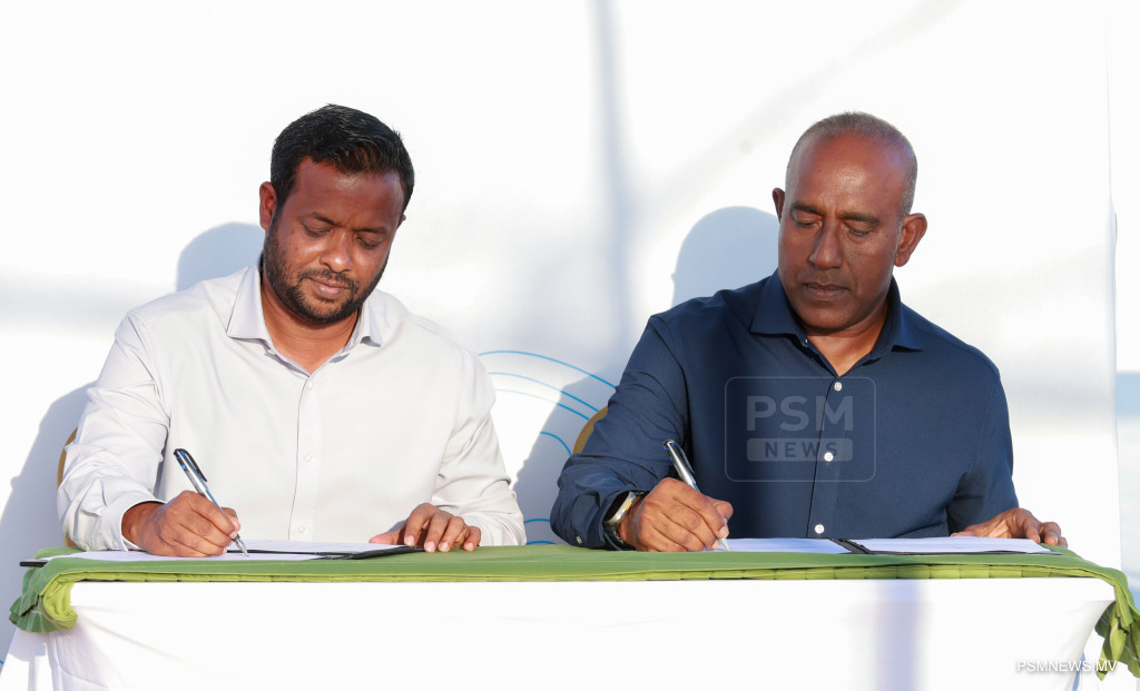 ކ. ގުޅީ ބަނދަރު ތަރައްޤީކުރުމުގެ މަޝްރޫޢުގެ މަސައްކަތް ހަވާލުކުރުމުގެ އެއްބަސްވުމުގެ އިމާރަތްކުރުމާއި ގެދޮރުވެރިކަމާއި ބިނާރާބެހޭ ވަޒީރު ޑރ. ޢަބްދުﷲ މުއްޠަލިބު އަދި އެމްޓީސީސީގެ މެނޭޖިން ޑިރެކްޓަރ އަޙުމަދު ސަޢުދީ ސޮއިކުރައްވަނީ / ފޮޓޯ: މުޙައްމަދު ވަޙީދު، ޕީއެސްއެމް ނިއުސް