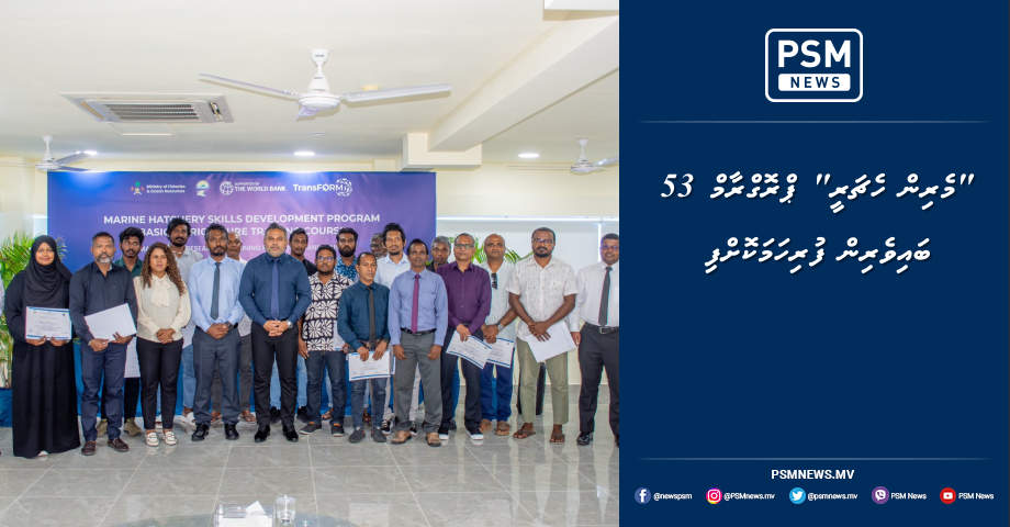 ފާނަ އާލާ ކުރުމުގެ މަސައްކަތަށް މީހުން ތަމްރީންކުރުމަށް ކުރިއަށްގެންދާ "މެރިން ހެޗަރީ ސްކިލްސް ޑިވެލޮޕްމަންޓް ޕްރޮގްރާމް"ގެ ދަށުން މިހާތަނަށް 53 މީހުން ތަމްރީނުކުރެވިފައިވާ ކަމަށް މަސްވެރިކަމާއި ކަނޑުގެ ވަސީލަތްތަކާއި ބެހޭ ވުޒާރާއިން ވިދާޅުވެއްޖެއެވެ.