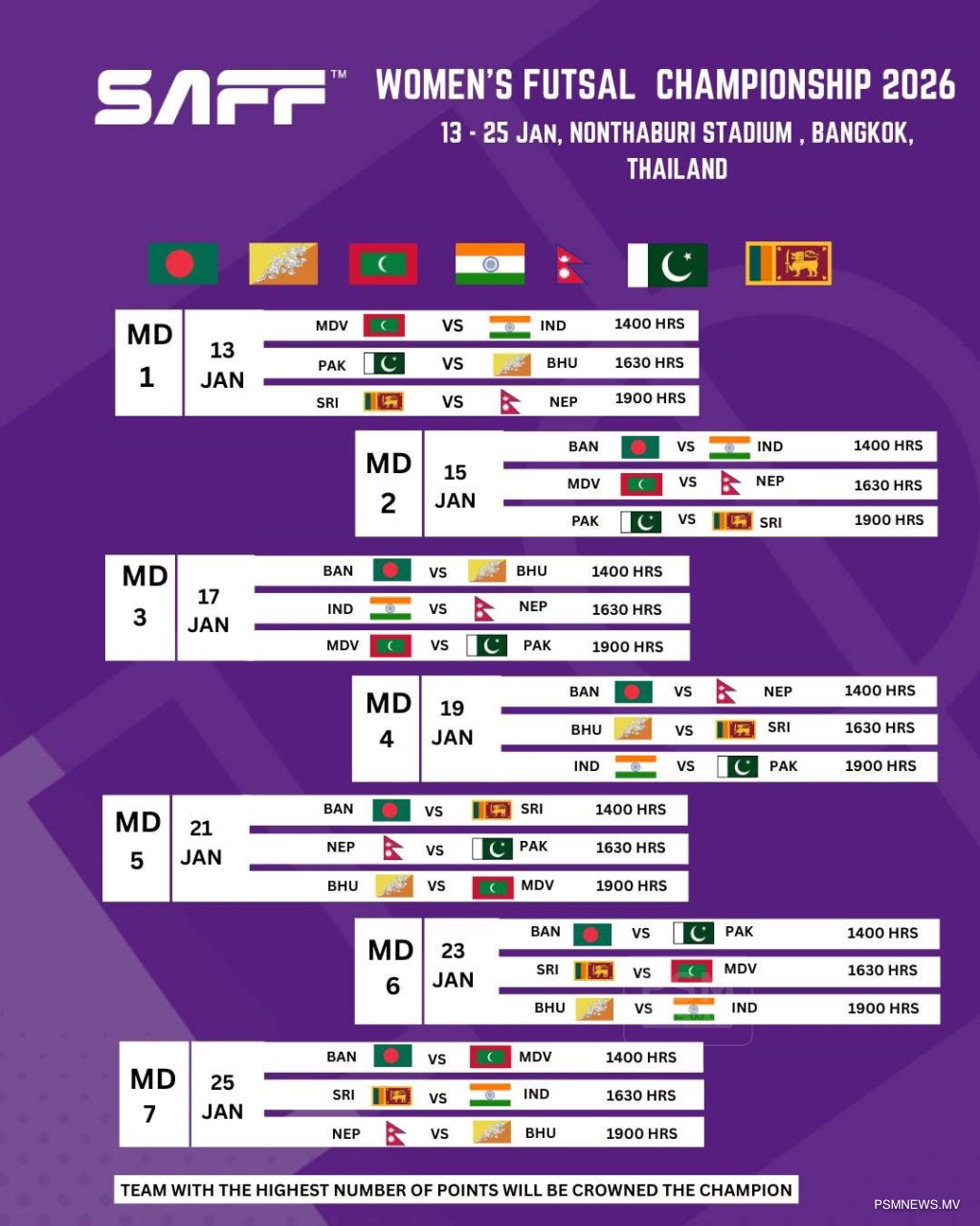 މި މުބާރާތް ހުޅުވާ މެޗުގައި ރާއްޖެއާއި އިންޑިއާ ނިކުންނާނި 13 ޖެނުއަރީގެ މެންދުރު 14:00 ގައެވެ. އެއަށްފަހު ރާއްޖެއަށް އޮންނާނީ 15 ޖެނުއަރީގައި ނޭޕާލް އާއި ދެކޮޅަށް ކުޅެންޖެހޭ މެޗެވެ. އަދި 21 ޖެނުއަރީގައި ބޫޓާން އާއި ދެކޮޅަށް މެޗެއް ކުޅެން ޖެހޭއިރު 25 ޖެނުއަރީގައި ނިކުންނާނީ ބަނގްލަދޭޝް އާއި ދެކޮޅަށެވެ. ސާފް ވުމެންސް ފުޓްސަލް ޗެމްޕިއަންޝިޕް 2026 ގެ ޗެމްޕިއަންކަން ލިބޭނީ އެންމެ ގިނަ ޕޮއިންޓް ހޯދާ ޓީމަކަށެވެ.