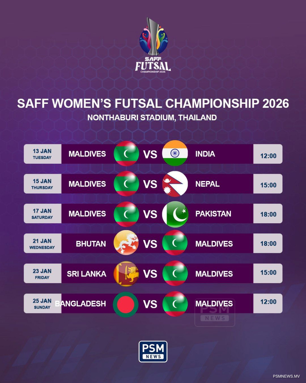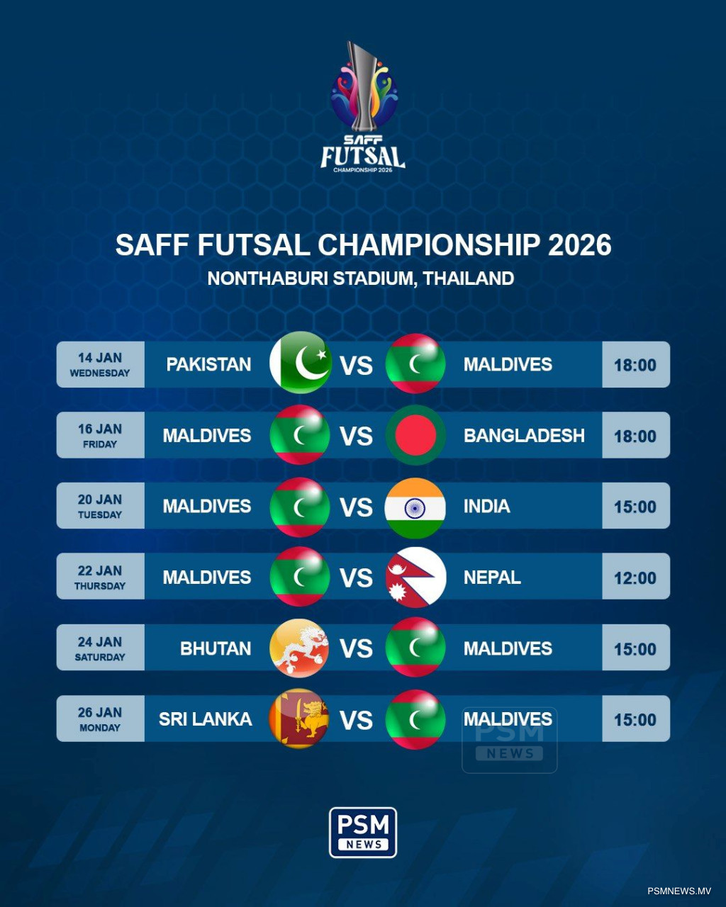 ސާފް ފުޓްސަލް ޗެމްޕިއަންޝިޕުގައި ވާދަކުރާ ރާއްޖޭގެ ޤައުމީ ފިރިހެން ފުޓްސަލް ޓީމުގެ ފުރަތަމަ މެޗުގައި ޖެނުއަރީ 14 ވަނަ ދުވަހު ނުކުންނާނީ ޕާކިސްތާނާ ދެކޮޅަށެވެ. ރާއްޖެއިން ދެވަނަ މެޗުގައި 16 ވަނަ ދުވަހު ނުކުންނާނީ ބަންގްލަދޭޝްއާ ދެކޮޅަށެވެ. އަދި ތިންވަނަ މެޗުގައި 20 ވަނަ ދުވަހު ރާއްޖެއިން އިންޑިޔާއާ ދެކޮޅަށް ނުކުންނަން ޖެހޭއިރު ހަތަރު ވަނަ މެޗުގައި 22 ވަނަ ދުވަހު ރާއްޖެއިން ވާދަކުރާނީ ނޭޕާލާއެވެ. މުބާރާތުގައި ރާއްޖެއިން ކުޅޭ ފަސްވަނަ މެޗުގައި 24 ވަނަ ދުވަހު ބޫޓާނާ ދެކޮޅަށް ނުކުންނަން ޖެހޭއިރު ހަވަނަ މެޗުގައި 26 ވަނަ ދުވަހު ނުކުންނާނީ ސްރީ ލަންކާއާ ދެކޮޅަށެވެ.