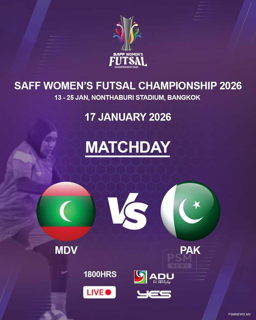 މުބާރާތުގައި ރާއްޖެއާއި ޕާކިސްތާނުގެ އަންހެން ޤައުމީ ޓީމު ވާދަކުރާ މެޗު އޮންނާނީ ތައިލެންޑުގެ ނޮންތަބުރީ އިންޑޯ ސްޓޭޑިއަމުގައި، 18:00 ގައެވެ.