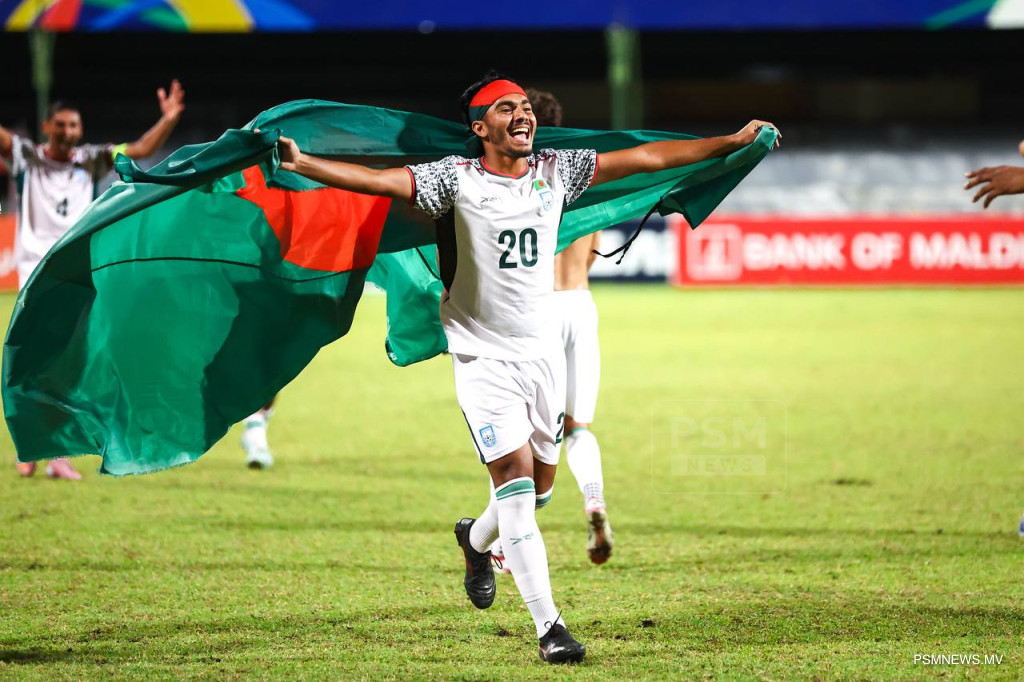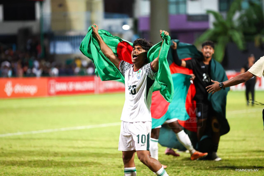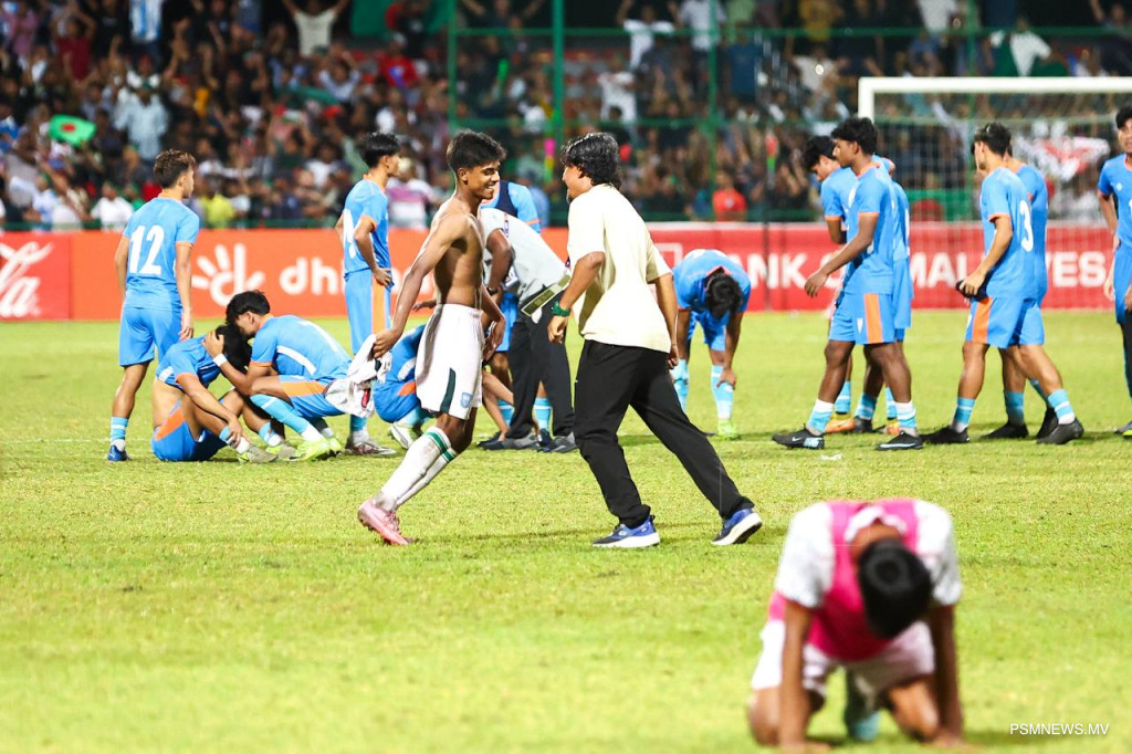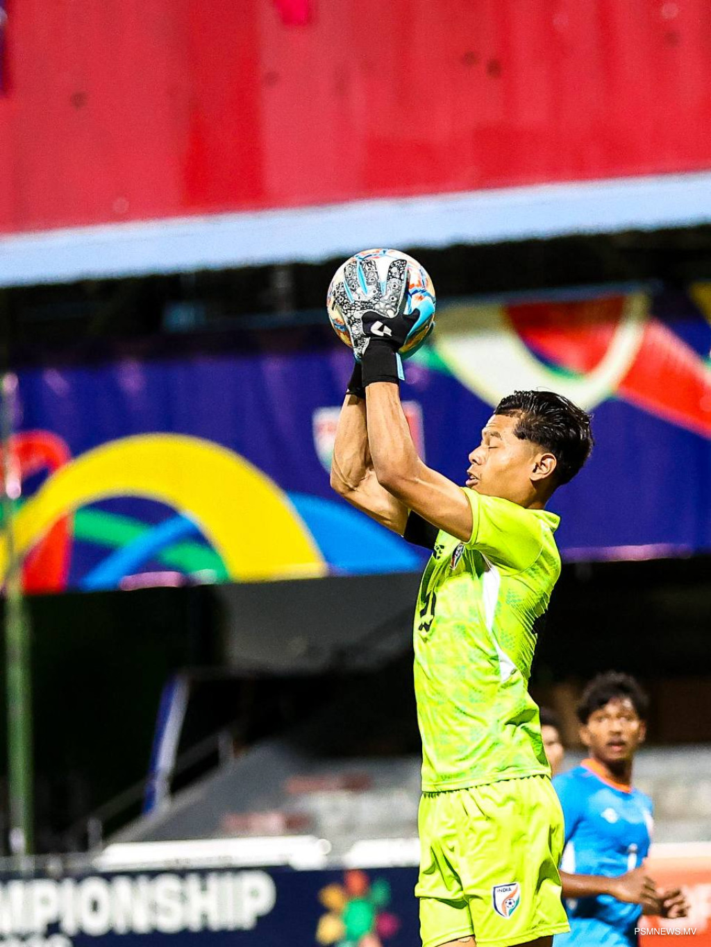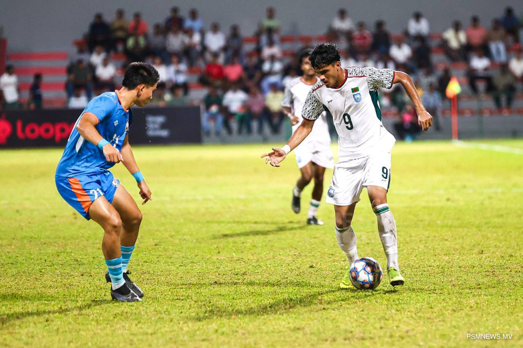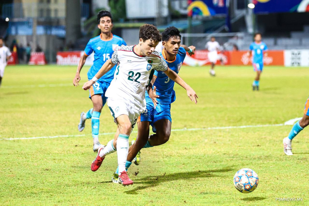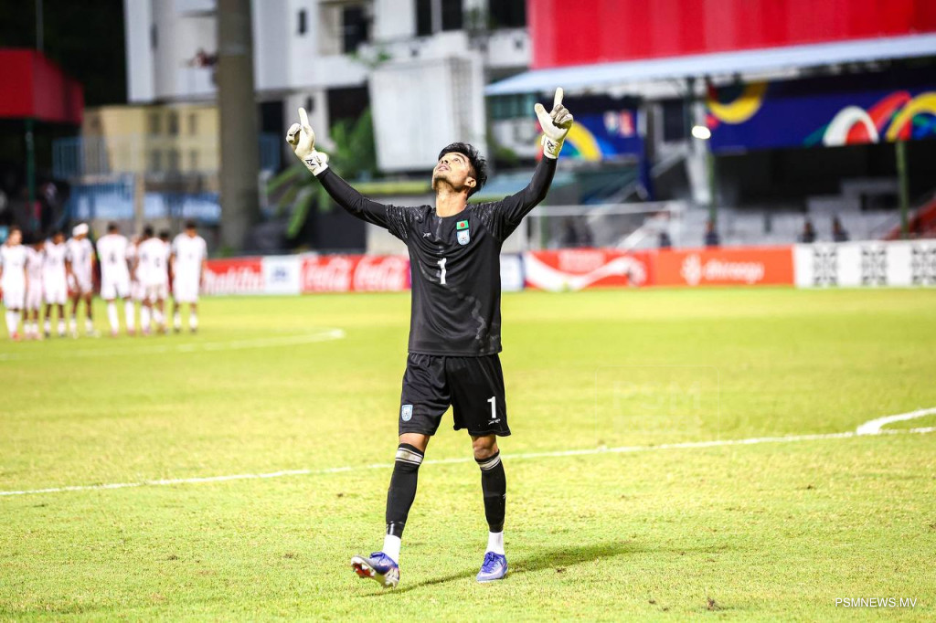 20 އަހަރުން ދަށުގެ ސާފް ޗެމްޕިއަންޝިޕްގެ ފައިނަލުގައި އިންޑީއާއި ބަންގްލަދޭޝް ބައްދަލުކުރި މެޗުގެ ތެރެއިން. ޕެނަލްޓީގައި ބަންގްލަދޭޝްއިން ކުރިހޯދީ 3-4 އިން އިންޑިއާ ބަލިކޮށްގެންނެވެ. ފޮޓޯ: ޖަލްވާން ޖަމީލް، ޕީއެސްއެމް ނިއުސް