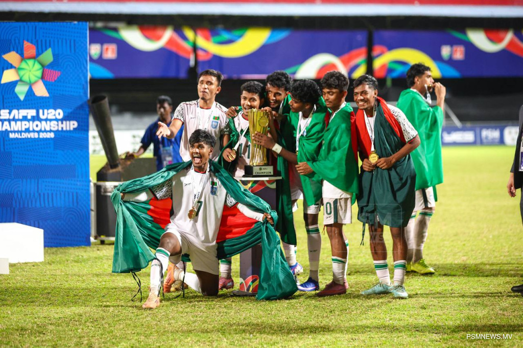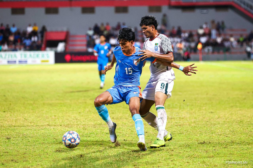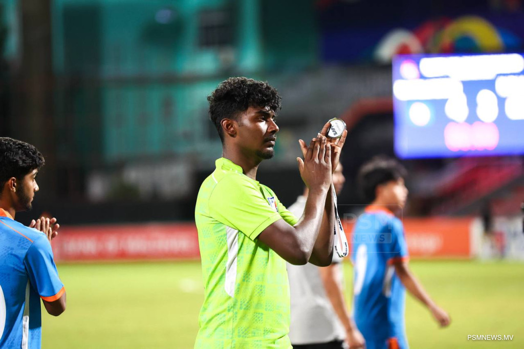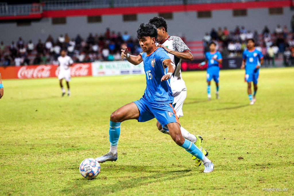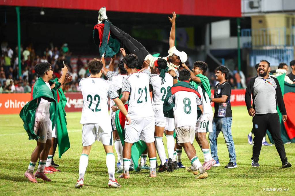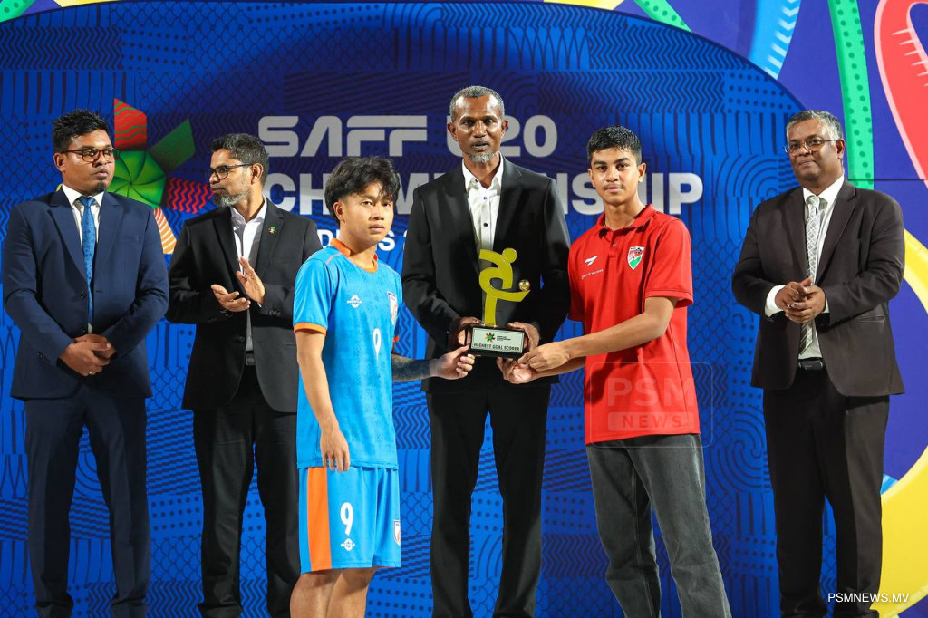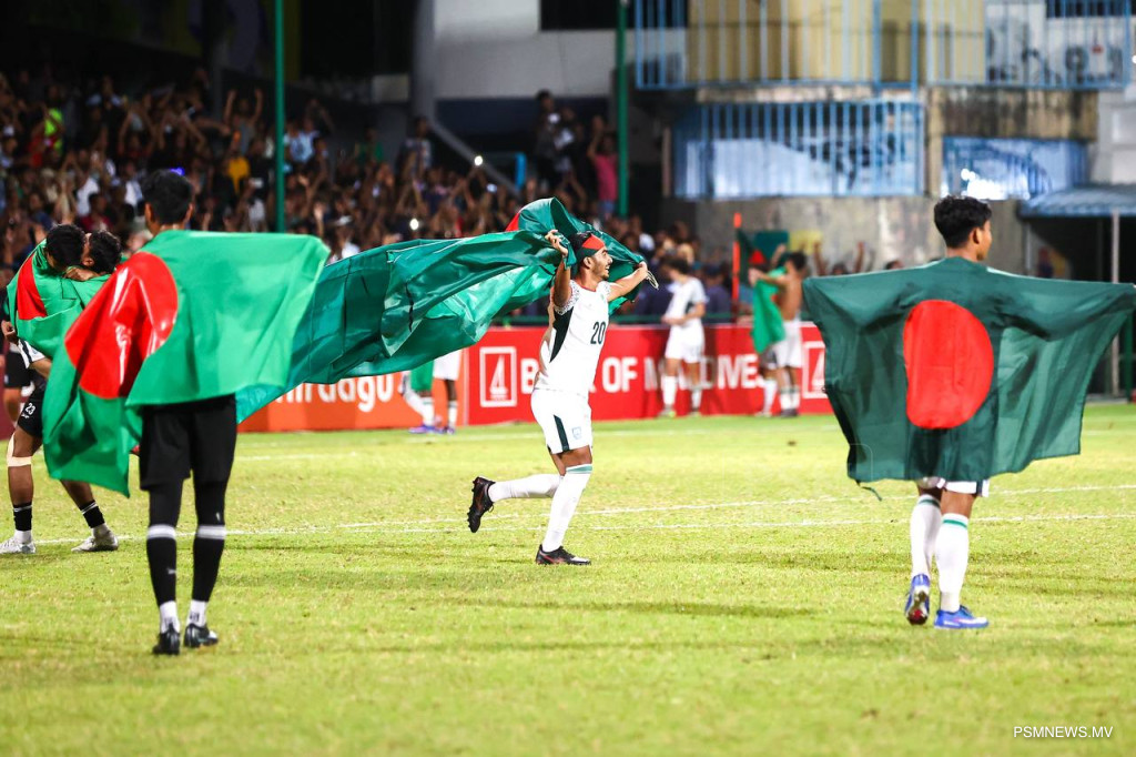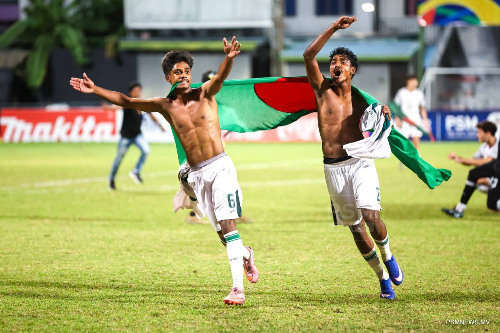 20 އަހަރުން ދަށުގެ ސާފް ޗެމްޕިއަންޝިޕްގެ ފައިނަލުގައި އިންޑީއާއި ބަންގްލަދޭޝް ބައްދަލުކުރި މެޗުގެ ތެރެއިން. ޕެނަލްޓީގައި ބަންގްލަދޭޝްއިން ކުރިހޯދީ 3-4 އިން އިންޑިއާ ބަލިކޮށްގެންނެވެ. ފޮޓޯ: ޖަލްވާން ޖަމީލް، ޕީއެސްއެމް ނިއުސް