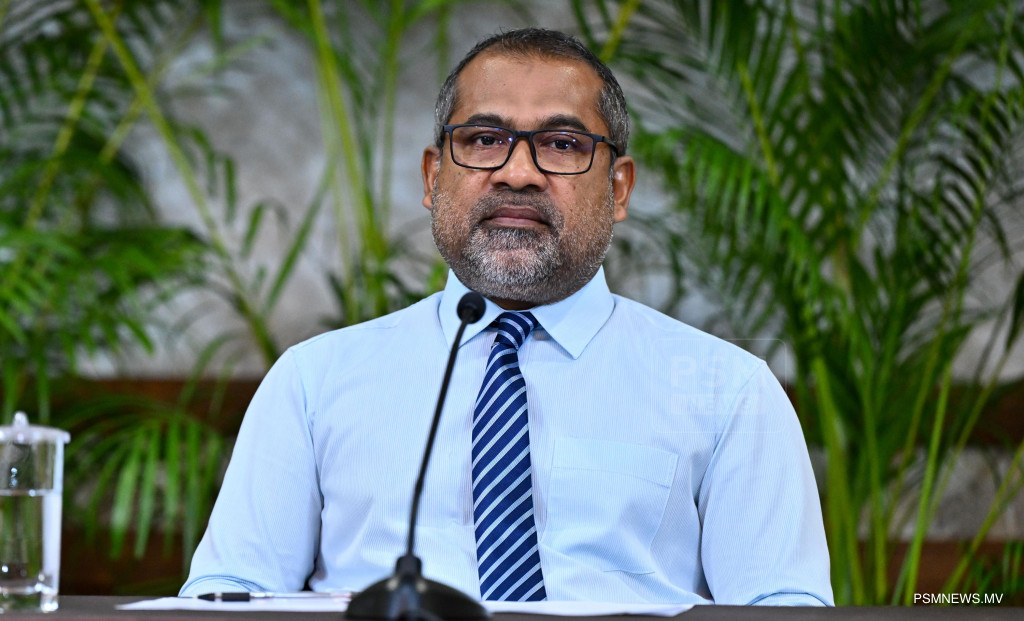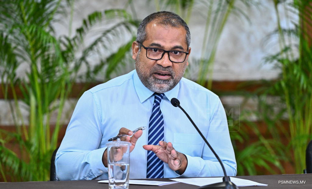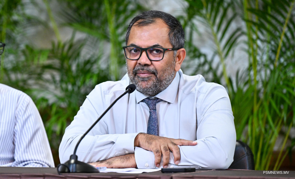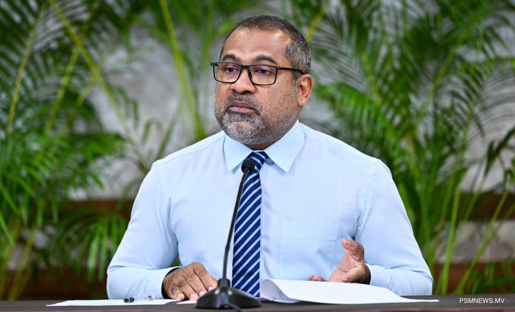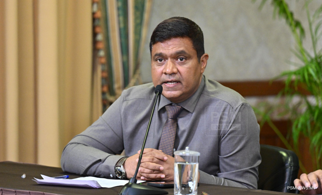 މެދުއިރުމަތީގައި ކުރަމުންދާ ހަނގުރާމައާ ގުޅިގެން ރައީސުލްޖުމްހޫރިއްޔާ އުފައްދަވާފައިވާ ވަޒީރުންގެ ފެންވަރުގެ ކޮމެޓީން ބޭއްވި ނޫސްވެރިންގެ ބައްދަލުވުމުގައި މަދަނީ އުދުހުންތަކާބެހޭ ވަޒީރު މުހައްމަދު އަމީން ވާހަކަފުޅު ދައްކަވަނީ ފޮޓޯ: ރައީސް އޮފީސް