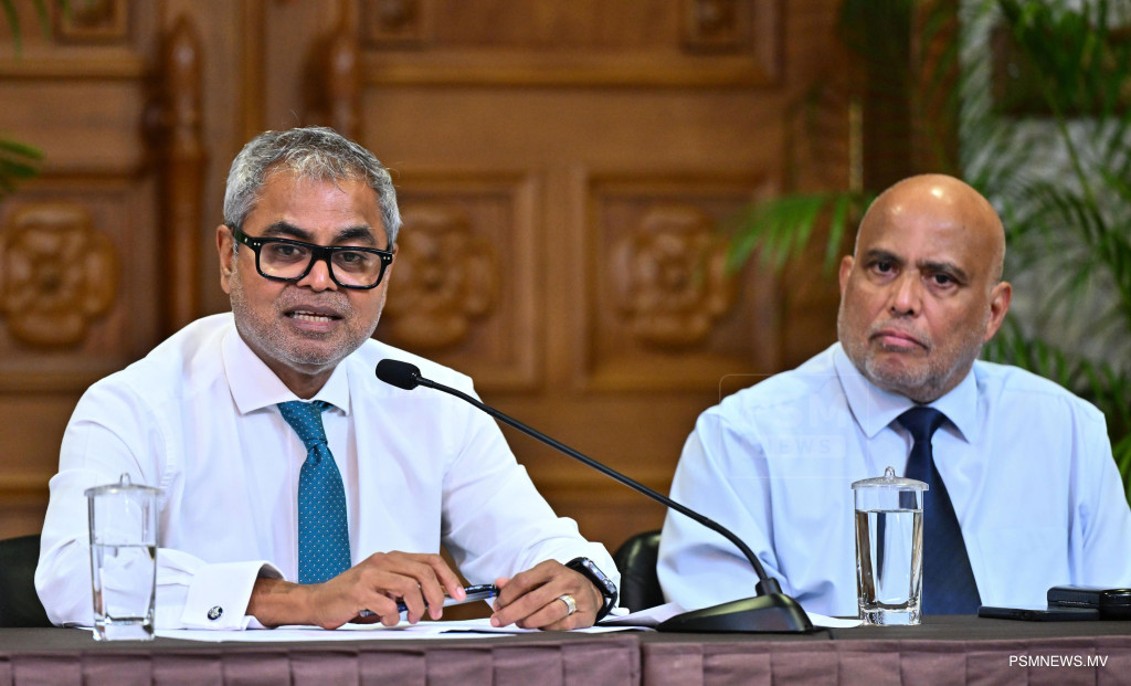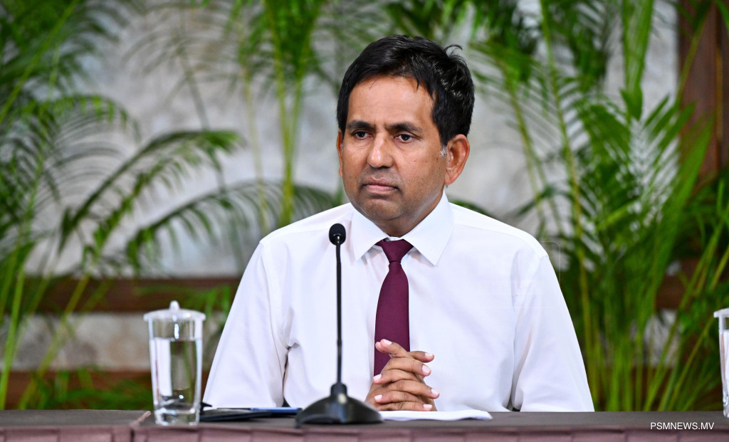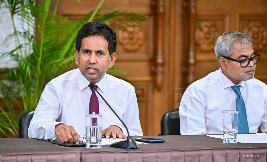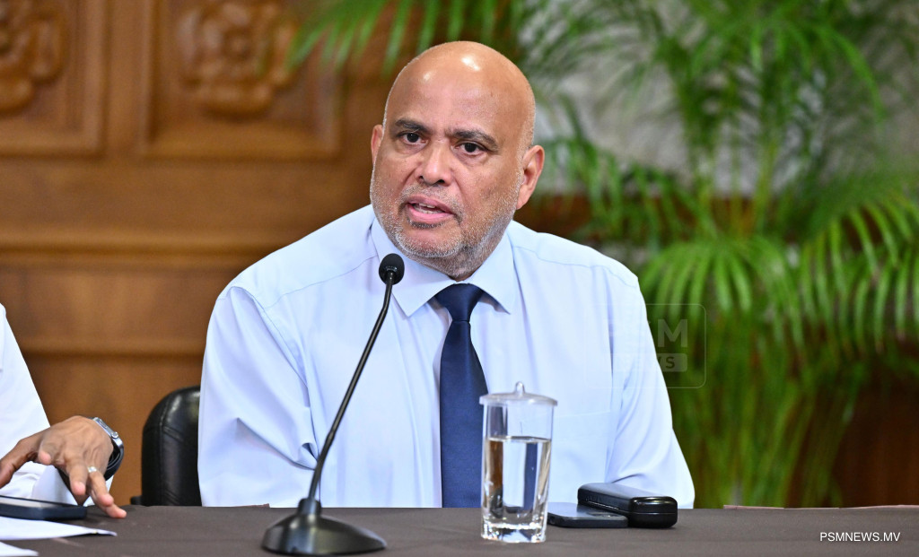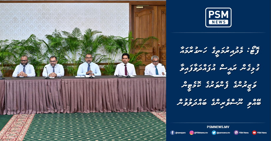 މެދުއިރުމަތީގައި ކުރަމުންދާ ހަނގުރާމައާ ގުޅިގެން ރައީސުލްޖުމްހޫރިއްޔާ އުފައްދަވާފައިވާ ވަޒީރުންގެ ފެންވަރުގެ ކޮމެޓީން ބޭއްވި ނޫސްވެރިންގެ ބައްދަލުވުމުގައި ވާހަކަފުޅު ދައްކަވަނީ ފޮޓޯ: ރައީސް އޮފީސް