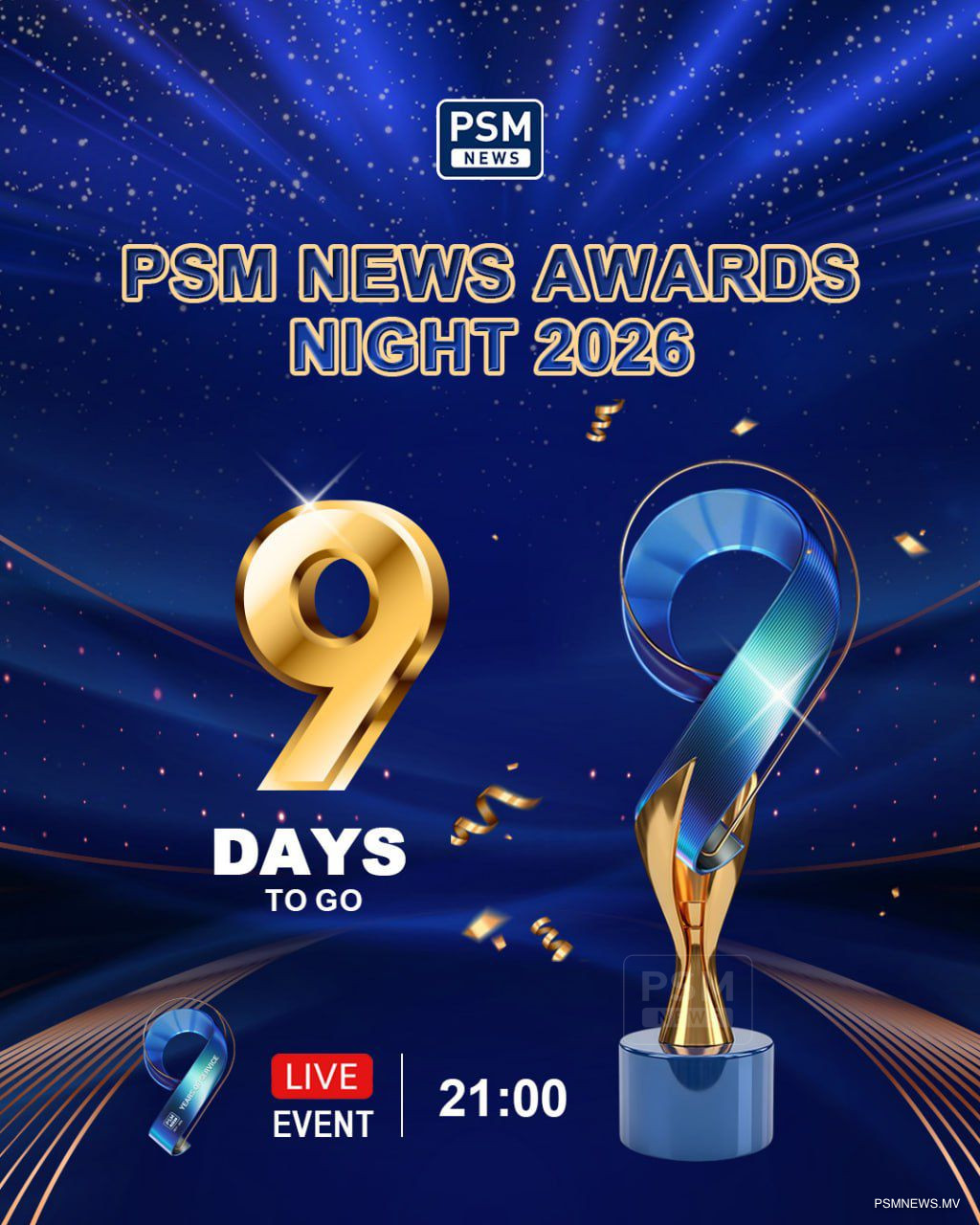 "ޕީއެސްއެމް ނިއުސް" އަށް 9 އަހަރު ފުރުން ފާހަގަކުރުމުގެ ގޮތުން ބާއްވާ ޚާއްސަ އެވޯޑް ޙަފްލާ އަންނަމަހު 3 ވަނަ ދުވަހު ބޭއްވުމަށް ނިންމައިފިއެވެ.