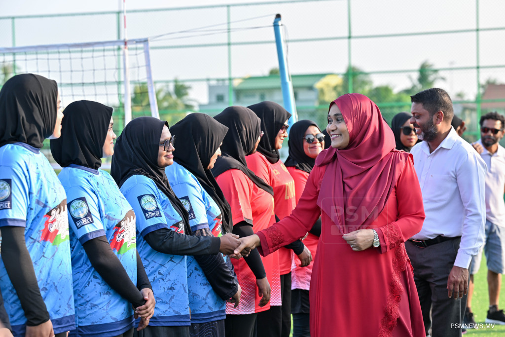 First Lady Sajidha Mohamed has inaugurated the volleyball court developed in Meedhoo, Dhaalu Atoll.